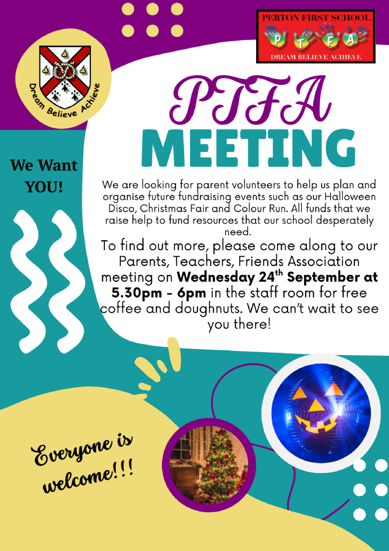 Leave a message at the School Office, email us at office.support@perton-first.staffs.sch.uk, find us on Facebook (Perton First School PTFA), or come to our next event.